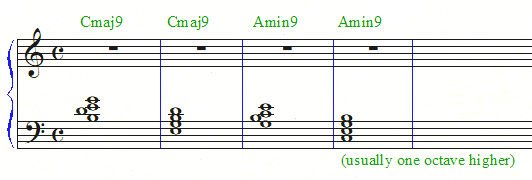For all major and minor chords, I try to use both the seventh and the ninth. I also use mostly rootless chords. I mainly use these two voicings. In ascending order, I use either 7-9-3-5 or 3-5-7-9. For example, for "C" major, I could play B-D-E-G. or E-G-B-D.